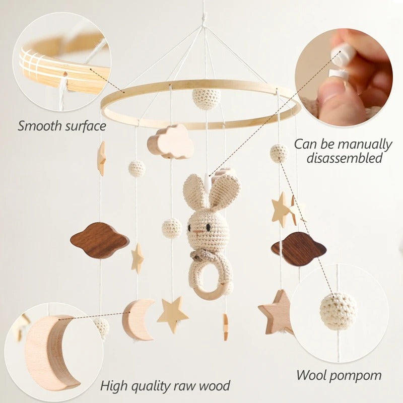 Baby Wooden Crib Mobile with Cartoon Rabbit Bells – Hanging Rattles Toy Holder and Arm Bracket, Perfect Gift for Kids